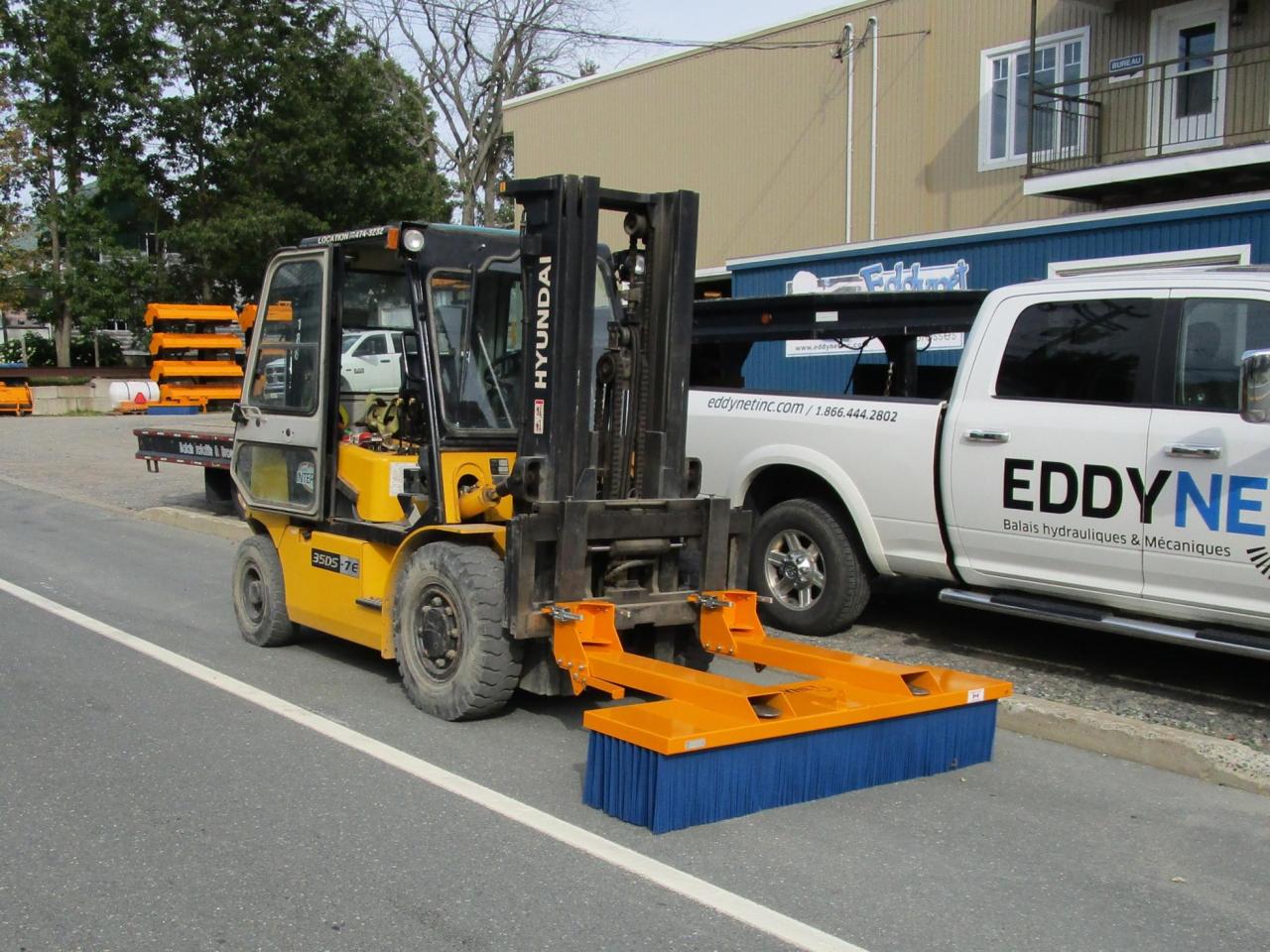 Le balai droite BDL balaie en poussant ou en tirant.  La brosse s'adapt au fourche du chariot élévateur.