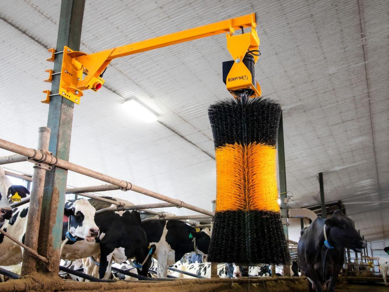 La brosse à vaches EDDYNET offre aux animaux de producteurs laitiers confort et efficacité. La brosse s’active automatiquement dès que la vache la pousse légèrement. La sensibilité d’activation, la limitation du couple et le délai de fonctionnement sont ajustables. La brosse est munie d’un bras long permettant aux animaux de passer de chaque côté. Lors de maintenance ou pour passer un équipement dans l’allée, le retrait d’un simple bouton permet de faire pivoter le bras, libérant ainsi l’espace de travail. Le motoréducteur peut être banché à une alimentation 110 ou 220 VAC.
